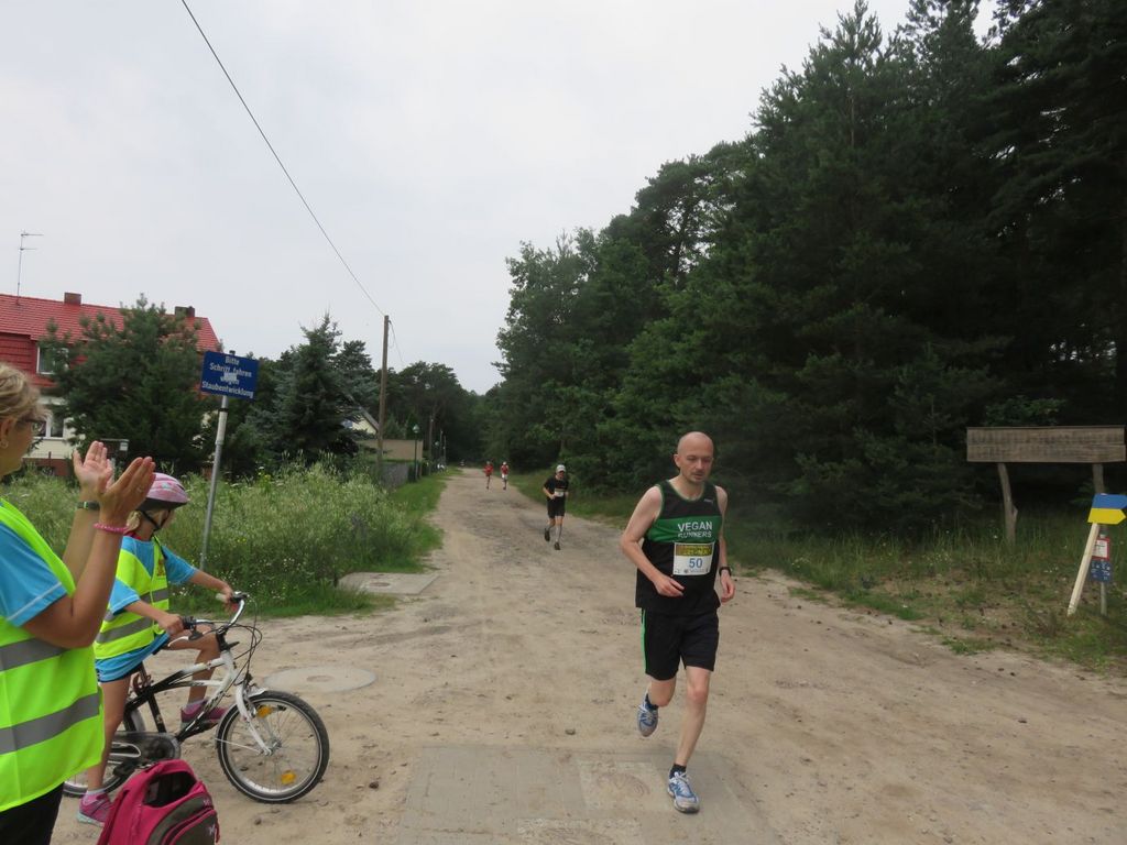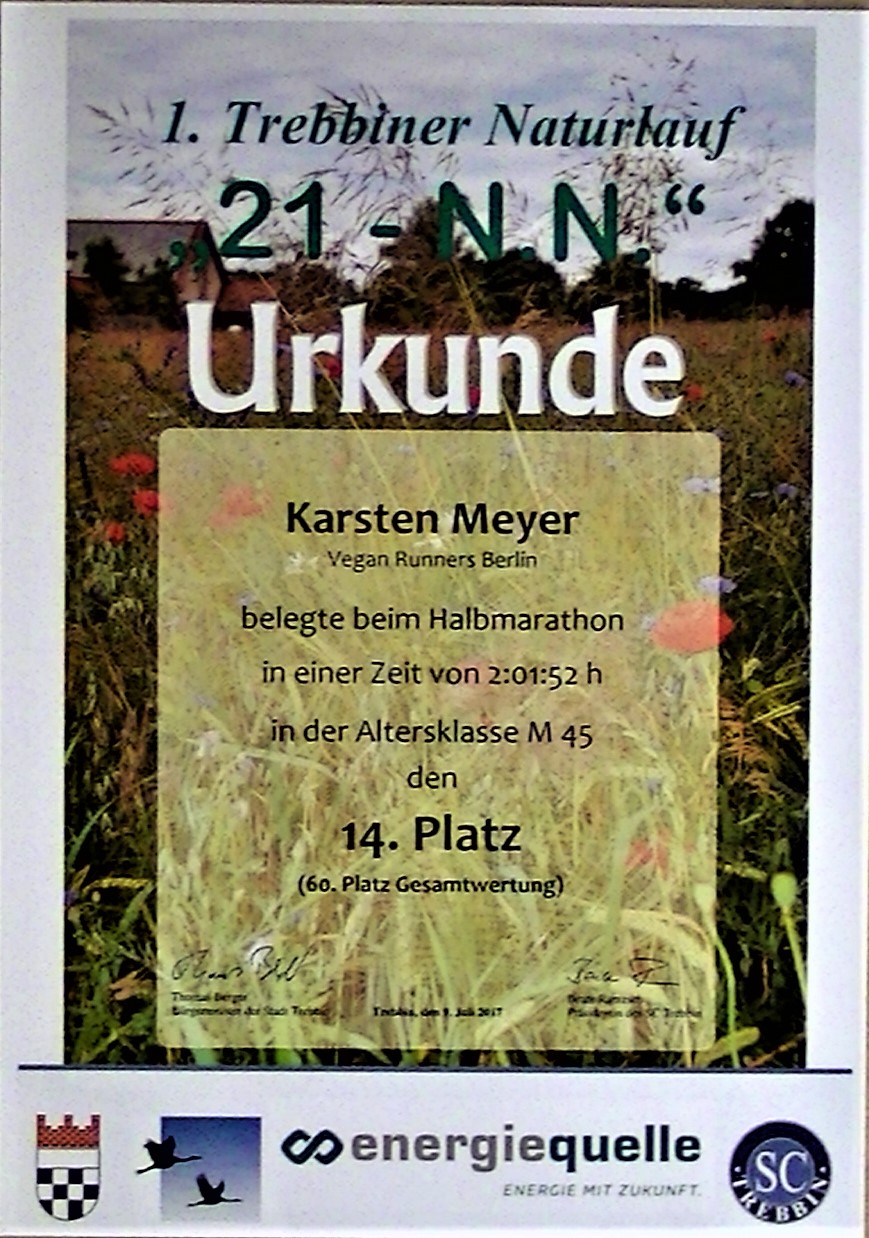 Der Naturlauf in Treb­bin war meine erste Laufver­anstal­tung in diesem Jahr und mein erster Halb­marathon über­haupt. Das Wet­ter passte: weniger als 20°, kaum Wind, starke Bewölkung. Während der zweit­en Hälfte des Ren­nens nieselte es leicht. Start war um 10 Uhr MESZ. Mehr als 100 Läuferin­nen und Läufer trat­en an. Ein bekan­nter aus früheren Laufver­anstal­tun­gen, Win­fried, war dabei, aber ich war der einzige Veg­an Runner.