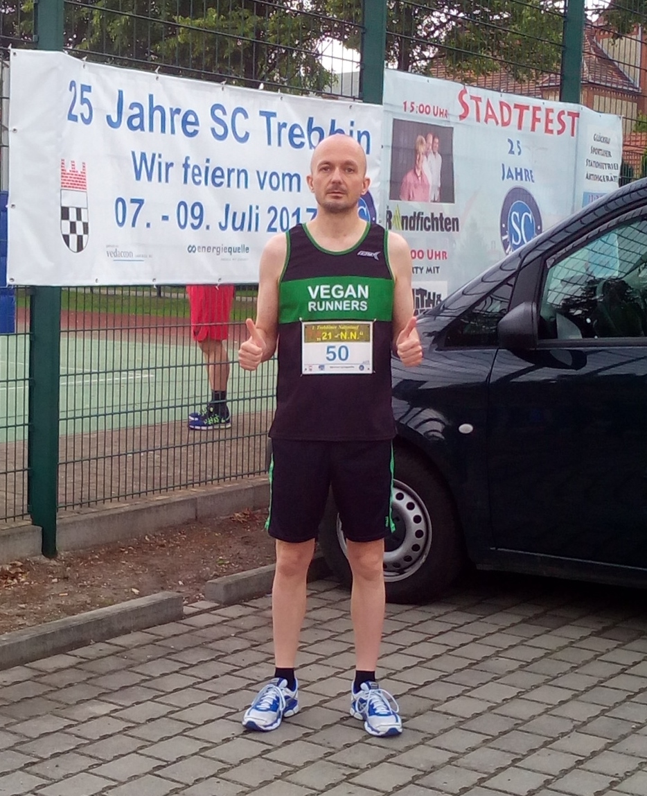 Der Naturlauf in Trebbin war meine erste Laufveranstaltung in diesem Jahr und mein erster Halbmarathon überhaupt. Das Wetter passte: weniger als 20°, kaum Wind, starke Bewölkung. Während der zweiten Hälfte des Rennens nieselte es leicht. Start war um 10 Uhr MESZ. Mehr als 100 Läuferinnen und Läufer traten an. Ein bekannter aus früheren Laufveranstaltungen, Winfried, war dabei, aber ich war der einzige Vegan Runner.